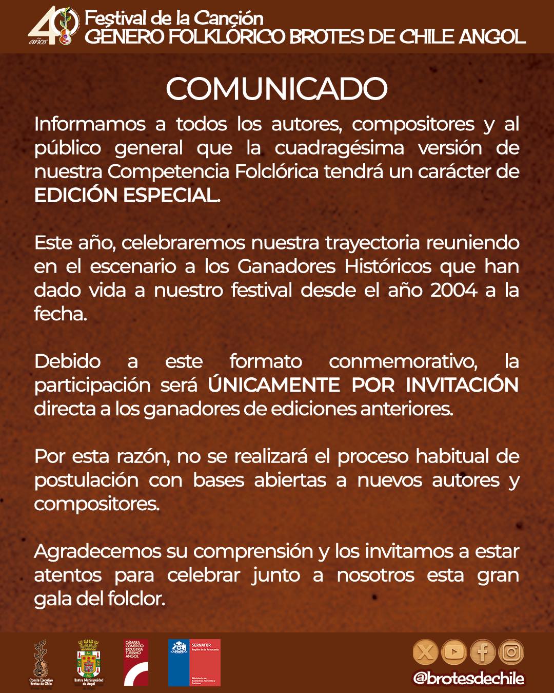 La cuadragésima versión del Festival Folclórico Brotes de Chile, Angol 2026, será especial ya que se realizará con invitación a los temas ganadores en las versiones anteriores.